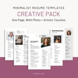 “A creative pack of five minimalist one‑page resume templates, each featuring integrated photo placement and subtle artistic touches. Fully editable in Canva, these designs combine clean layouts with modern flair — perfect for professionals in any industry and career stage.