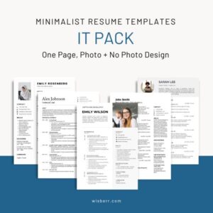 A collection of minimalist one‑page resume templates tailored for IT professionals. Designed to highlight clarity and career progression, these templates include both photo and no‑photo variations, making them versatile for different application standards and personal preferences.